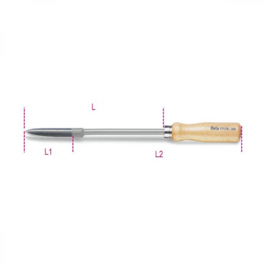 Трехгранный шабер 1717B Beta, разных размеров длины, 150мм, 200мм, 250мм применяется в обработке округлых плоскостей. Состоит из прочного стержня, выполненного из Cr-V стали и деревянной рукоятки. На инструмент нанесен слой износостойкой краски (или хромированное покрытие, по усмотрению производителя), что предотвращает появление ржавчины, а также увеличивает его срок службы.
